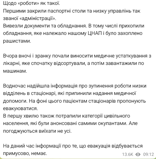 Також із лікарень вивозять обладнання, деякі відділення стаціонару перестали працювати. У зв'язку із цим пацієнтам пропонують евакуюватися.