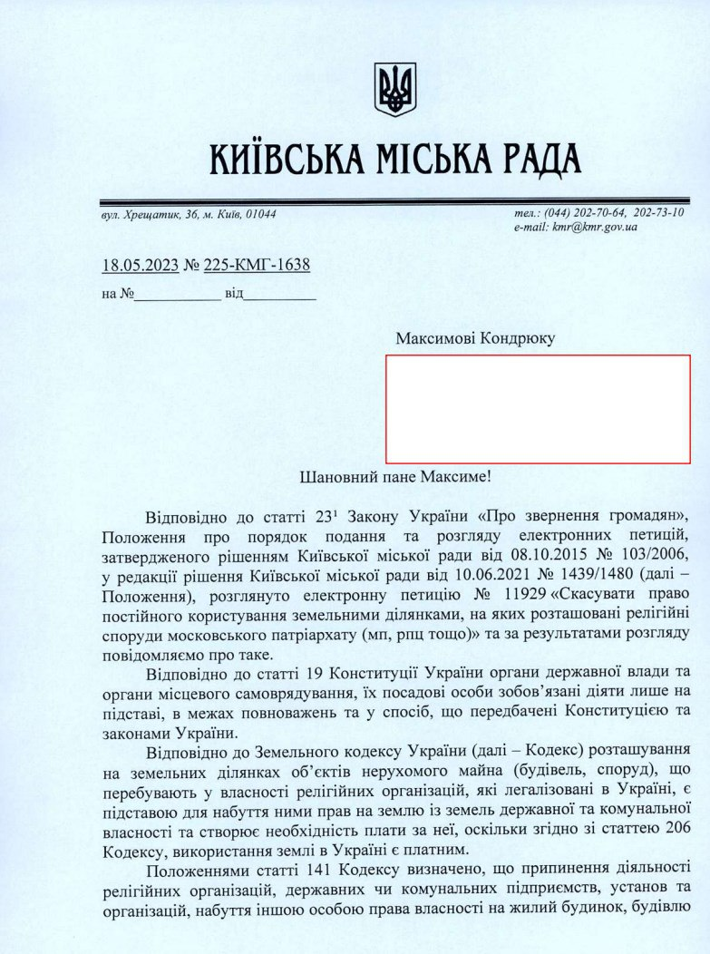 Раніше на сайті Київської міської ради відповіли на петицію, яка з'явилася на початку квітня. У ній закликали розірвати всі договори столиці із УПЦ. Петиція набрала потрібну для розгляду кількість голосів, тому на неї дали відповідь. У КМДА повідомили, що зможуть розірвати договори з УПЦ після рішення Верховної Ради.