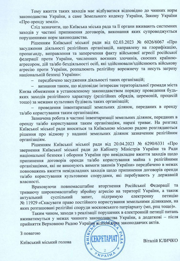 Мер Києва Віталій Кличко відповів на петицію забрати землю біля храмів УПЦ у столиці.