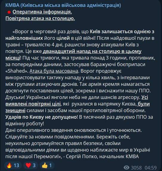 "Атаку було масовано. Ворог продовжує використовувати тактику нападу в кілька хвиль, з інтервалами між групами атакуючих дронів. Так армія кремля намагається досягти поставлених цілей, у тому числі й виснажити нашу ППО.