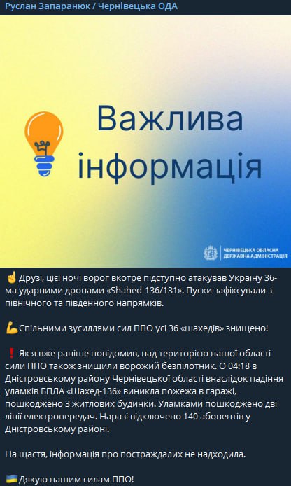 За даними голови Черновецької ОВА Руслана Запаранюка, пуски зафіксували за північним та південним напрямками. Падіння уламків БПЛА "Шахед-136" у Дністровському районі Чернівецької області сталося о 04:18.