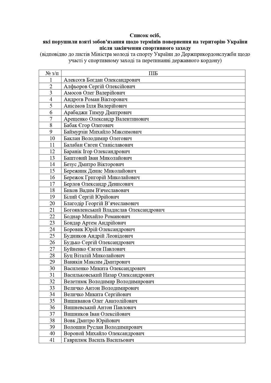 Міністерство спорту публікує список із 236 спортсменів, які не повернулися з-за кордону. Дозвіл на виїзд їм видано на час проведення спортивних заходів, але вчасно до України вони не повернулися.