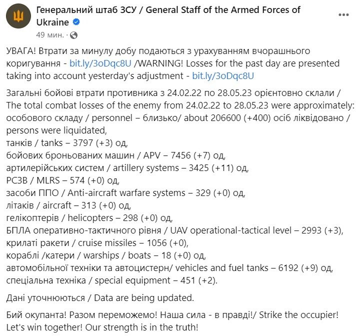 Загальні бойові втрати Росії станом на 28 травня орієнтовно склали 206 600 (+400) особового складу.