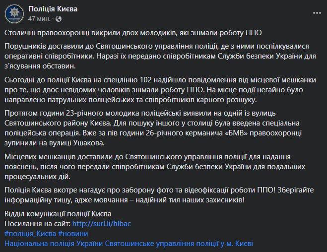 Повідомляється, що на спецлінію 102 надійшло повідомлення від місцевої мешканки про те, що двоє невідомих знімали роботу ППО. На місце були направлені патрульні поліцейські та співробітники карного розшуку.