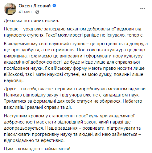 "На собі власне першим і відчув механізм відмови. Написав відповідну заяву і з учора вже не є кандидатом наук. Триматися за формальні для себе статуси не збираюся. Набагато важливіші реальні справи і дії", - повідомив він у Facebook.