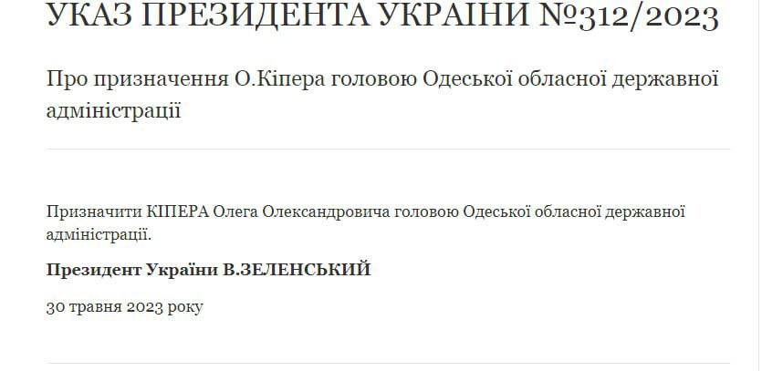 Президент підписав указ про призначення Олега Кіпера головою Одеської обласної військової адміністрації, раніше його кандидатуру було погоджено Кабміном.