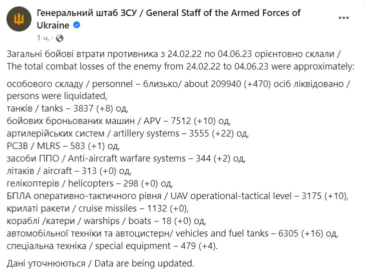 Втрати Росії у війні в Україні на ранок неділі, 4 червня, склали 470 окупантів, загальна кількість втрат російської армії з початку вторгнення складає 209 940 військових. Крім того, ЗСУ знищили 8 танків, 10 ББМ та 22 артсистеми за добу.