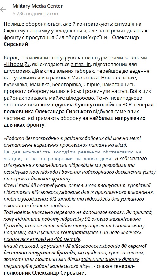 Сирський розповів про успішну роботу українських захисників, які за умов штурмів змогли відкинути ворога та просунутися на різних ділянках.