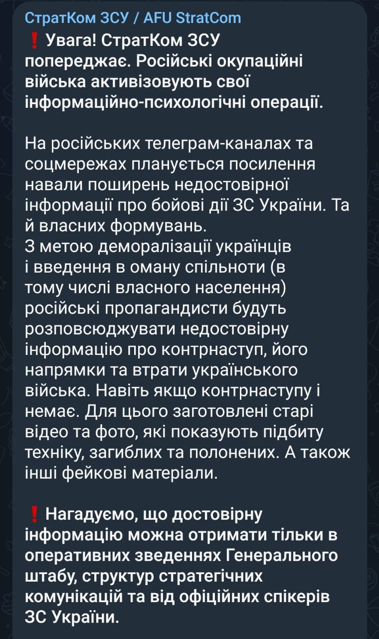 "Російські пропагандисти будуть розповсюджувати недостовірну інформацію про контрнаступ, його напрямки та втрати української армії. Навіть якщо контрнаступу і немає. Для цього заготовлені старі відео та фото, які показують підбиту техніку загиблих та полонених. А також інші фейкові матеріали", - заявили в Страткомі.