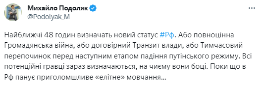 Радник глави Офісу президента України Михайло Подоляк заявив, що найближчі 48 годин визначать новий статус РФ. Про це він написав у своєму Twitter.