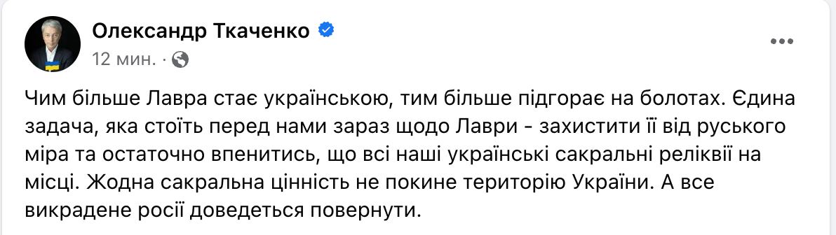 "Єдине завдання, яке стоїть перед нами зараз щодо Лаври - захистити її від російського світу і остаточно переконатися, що всі наші українські сакральні реліквії на місці. Жодна сакральна цінність не залишить територію України. А все вкрадене Росією доведеться повернути", - написав. глава Мінкульту.