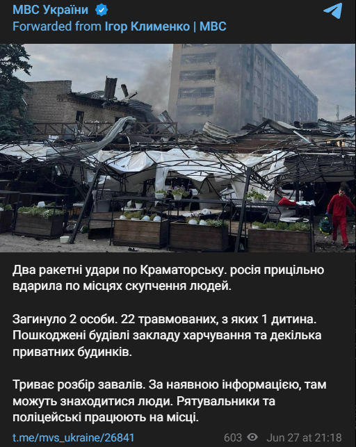 Станом на даний момент у Краматорську відомо вже про трьох загиблих цивільних внаслідок російського ракетного удару, повідомляє голова ВП Андрій Єрмак. 25 людей отримали поранення. З них одна дитина.