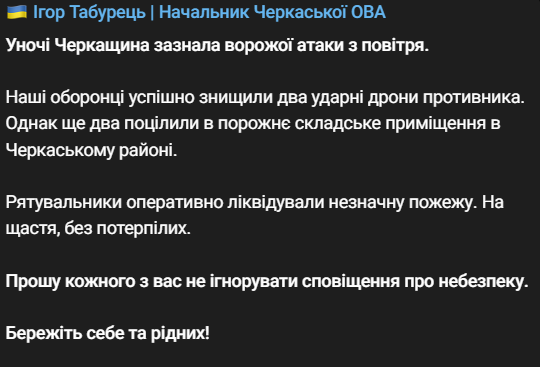 Росія вночі атакувала ударними дронами Черкаську область, є потрапляння до складського приміщення