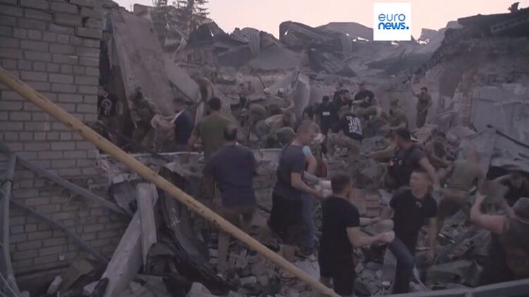 У Краматорську на місці ракетного удару по піцерії продовжують розбирати завали. Скріншот відео euronews