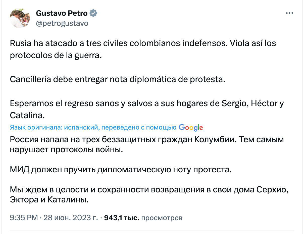 «Росія атакувала трьох беззахисних колумбійців. Тим самим порушивши закони війни. МЗС має вручити дипломатичну ноту протесту. Ми чекаємо на повернення Серхіо, Ектора та Каталіни у свої будинки», - написав Густаво Петро в Твіттері.