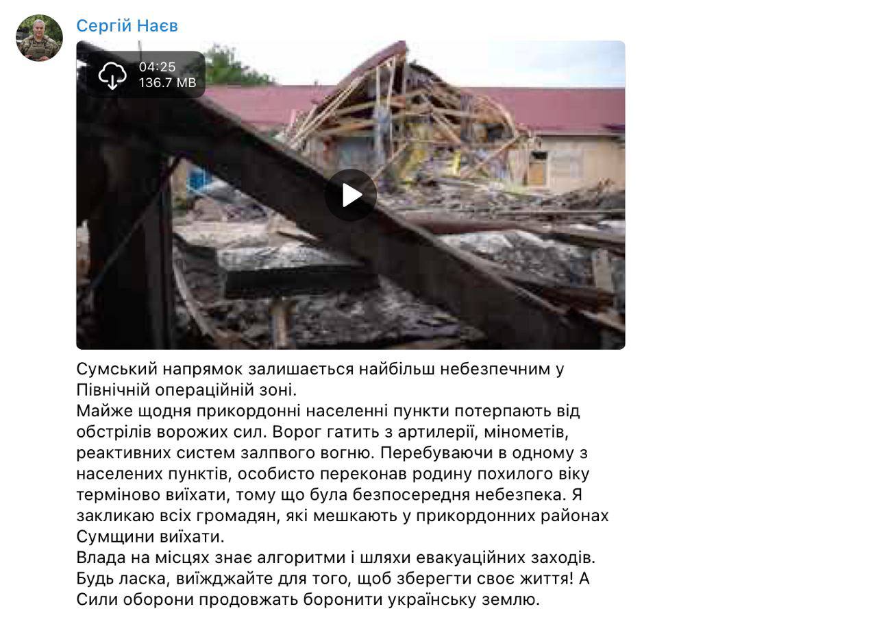 "Майже кожного дня прикордонні населені пункти зазнають обстрілів ворожих сил. Ворог б'є з артилерії, мінометів, реактивних систем залпового вогню. Я закликаю всіх громадян, які проживають у прикордонних районах Сумщини, поїхати. Будь ласка, їдьте для того, щоб зберегти своє життя!" - Написав Наєв.