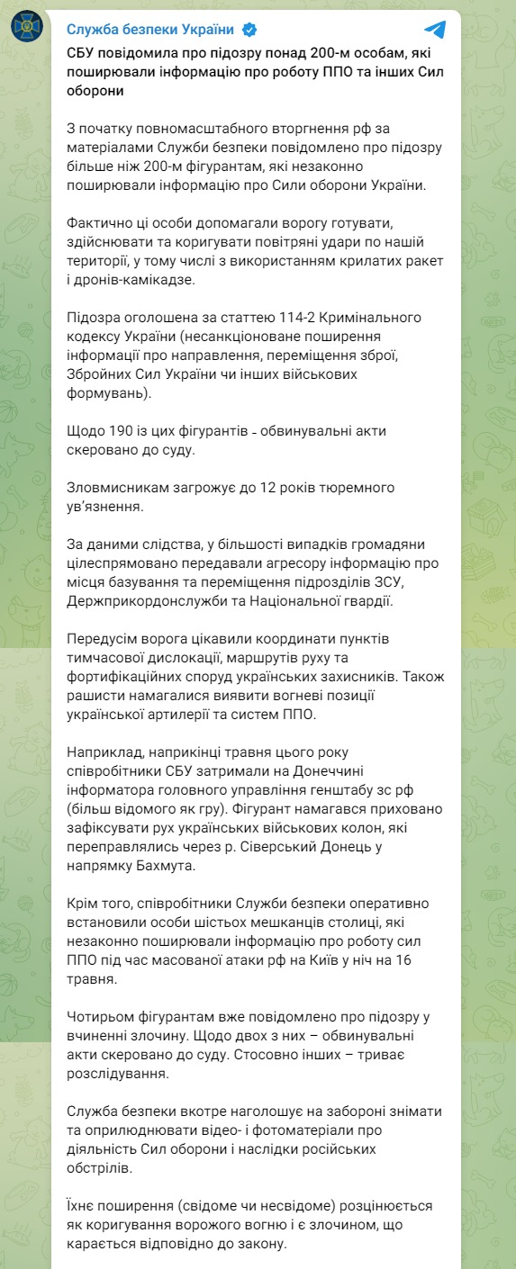 З початку повномасштабного вторгнення Служба безпеки України повідомила про підозру понад 200 громадян, які поширювали інформацію щодо роботи ППО та інших сил оборони. Підозра оголошена за статтею 114-2 Кримінального кодексу України - "несанкціоноване розповсюдження інформації про спрямування, переміщення зброї ЗСУ або іншими військовими формуваннями".