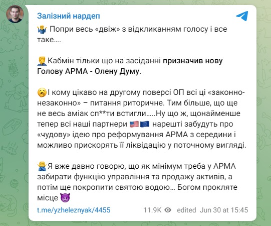Як писала "Страна", 28 червня стало відомо, що Дума - експерт з питань антикорупційної, екологічної та соціальної політики - перемогла у конкурсі на главу АРМА. У цьому раніше Дума публікувала багато статей, у яких критикувала діяльність АРМА і говорила про непрозору роботу агентства.