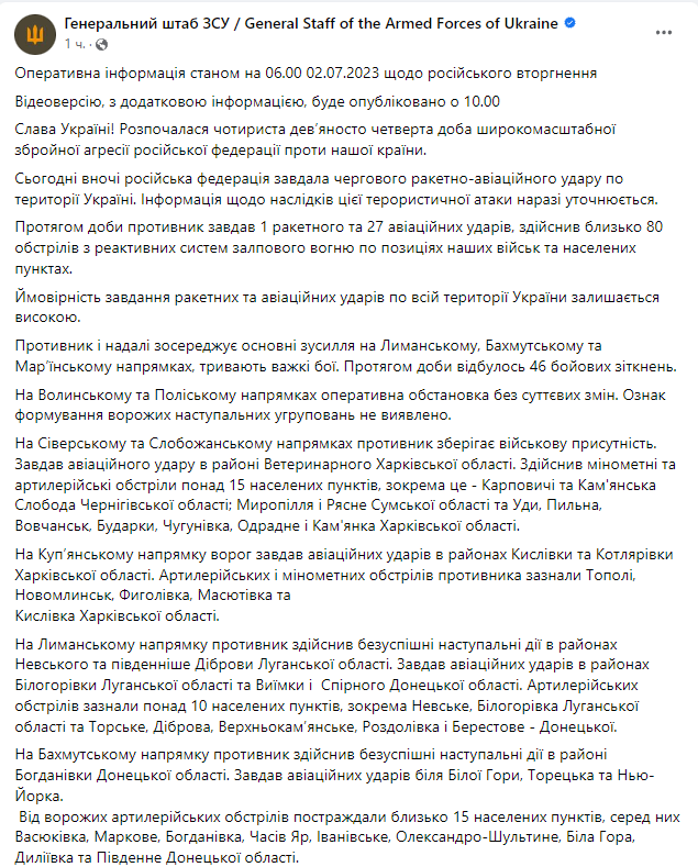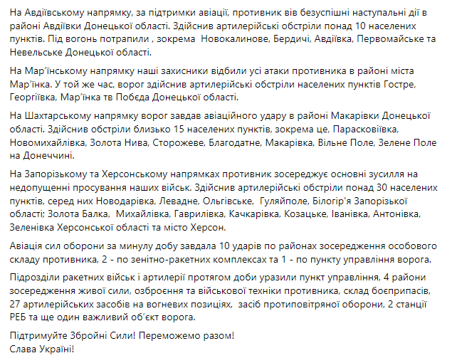 Повідомляється, що протягом доби противник завдав 1 ракетного та 27 авіаційних ударів, здійснив близько 80 обстрілів з реактивних систем залпового вогню за позиціями українських військ та населених пунктів.