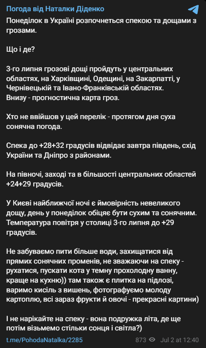 "3 липня грозові дощі пройдуть у центральних областях, Харківській, Одеській, Чернівецькій, Івано-Франківській областях та на Закарпатті. Хто не увійшов до цього списку – протягом дня суха сонячна погода", - пише Діденко.