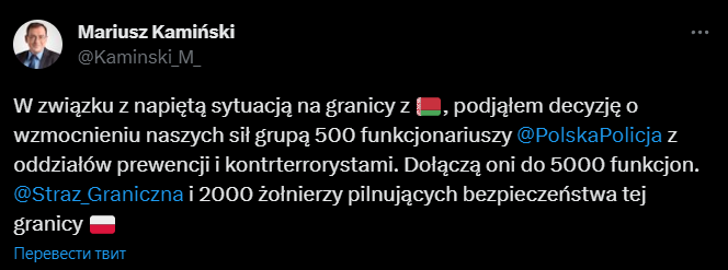 "У зв'язку з напруженою ситуацією на кордоні з Білоруссю я вирішив посилити наші сили 500 польськими поліцейськими із превентивних підрозділів та підрозділів контртероризму", - повідомив Камінський.