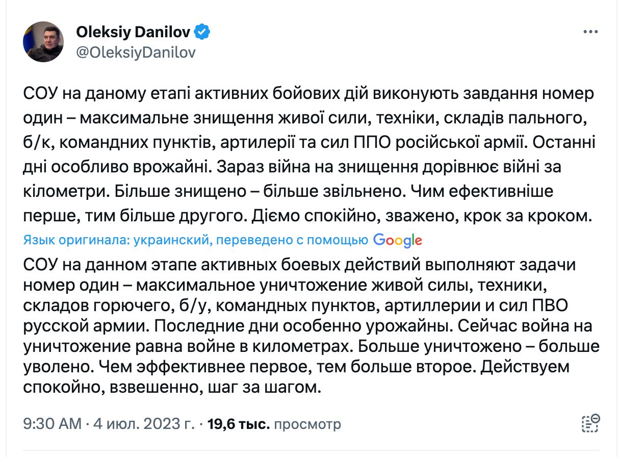 "Завдання номер один – максимальне знищення живої сили, техніки, складів пального, б/к, командних пунктів, артилерії та сил ППО російської армії. Останні дні особливо врожайні. Зараз війна на знищення дорівнює війні за кілометри. Більше знищено – більше звільнено", – пише Данилов.