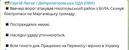 07.32 Учора ввечері росіяни атакували дронами Дніпропетровську область. Скинули боєприпаси на Марганецьку громаду. Обійшлося без постраждалих.
