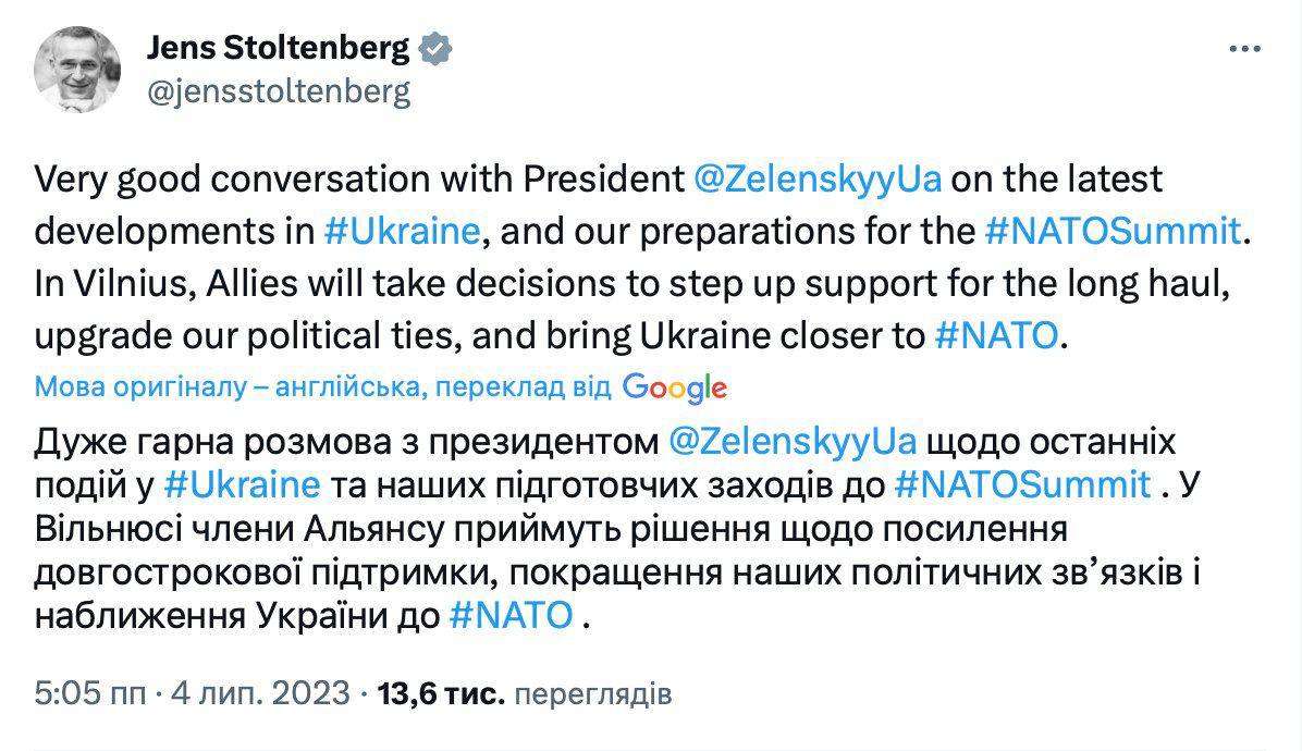 "У Вільнюсі союзники ухвалять рішення про посилення підтримки у довгостроковій перспективі, зміцнення наших політичних зв'язків та наближення України до НАТО", - написав генсек.