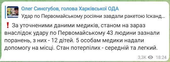 18.32 Станом на даний момент внаслідок удару по Первомайському 43 особи отримали поранення, з них 12 дітей.