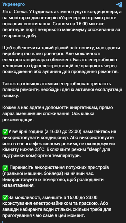 "Літо. Спека. У будинках активно гудуть кондиціонери, а на моніторах диспетчерів "Укренерго" стрімко зростає показник споживання. Станом на 16:00 ми перетнули поріг вечірнього максимуму споживання за вчорашню добу", - йдеться у повідомленні.