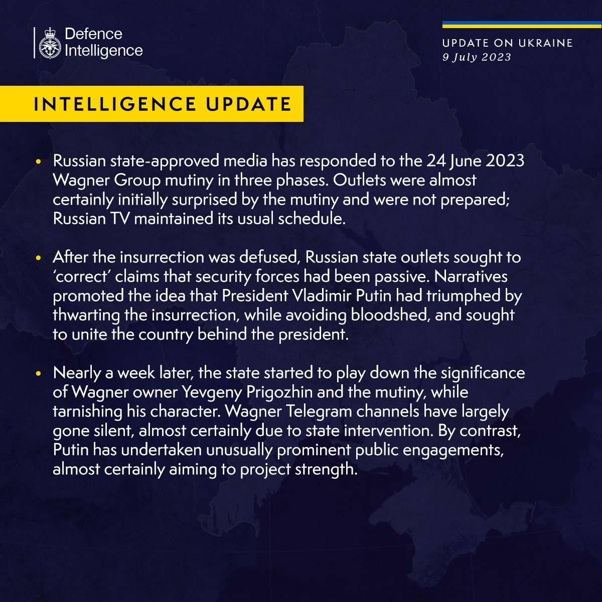 "Після придушення повстання російські державні ЗМІ намагалися виправити заяви про пасивність сил безпеки. Наративи пропагували ідею, що президент Володимир Путін переміг, зірвавши повстання, уникнувши кровопролиття, і прагнув об'єднати країну по президенту", – йдеться у звіті розвідки.