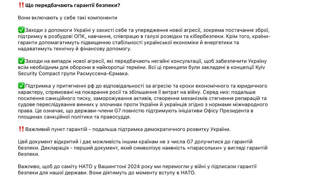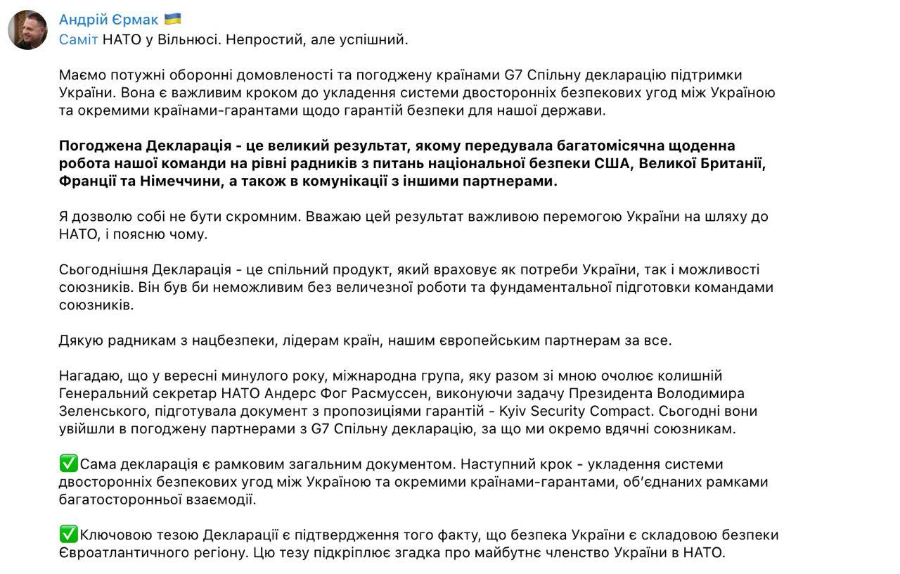 Як і писав Єрмак, це ще не самі гарантії, а декларація про початок переговорів із Україною щодо їх підписання.