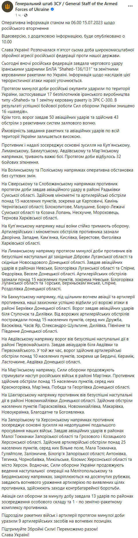 Генштаб ЗСУ публікує оперативне військове зведення на ранок 15 липня. Вночі РФ завдала чергового удару "Шахедами" та зенітними керованими ракетами по Україні, випустивши 17 безпілотників іранського виробництва типу "Shahed" та 1 зенітну керовану ракету із ЗРК С-300. Українське ППО знищило 16 цілей.