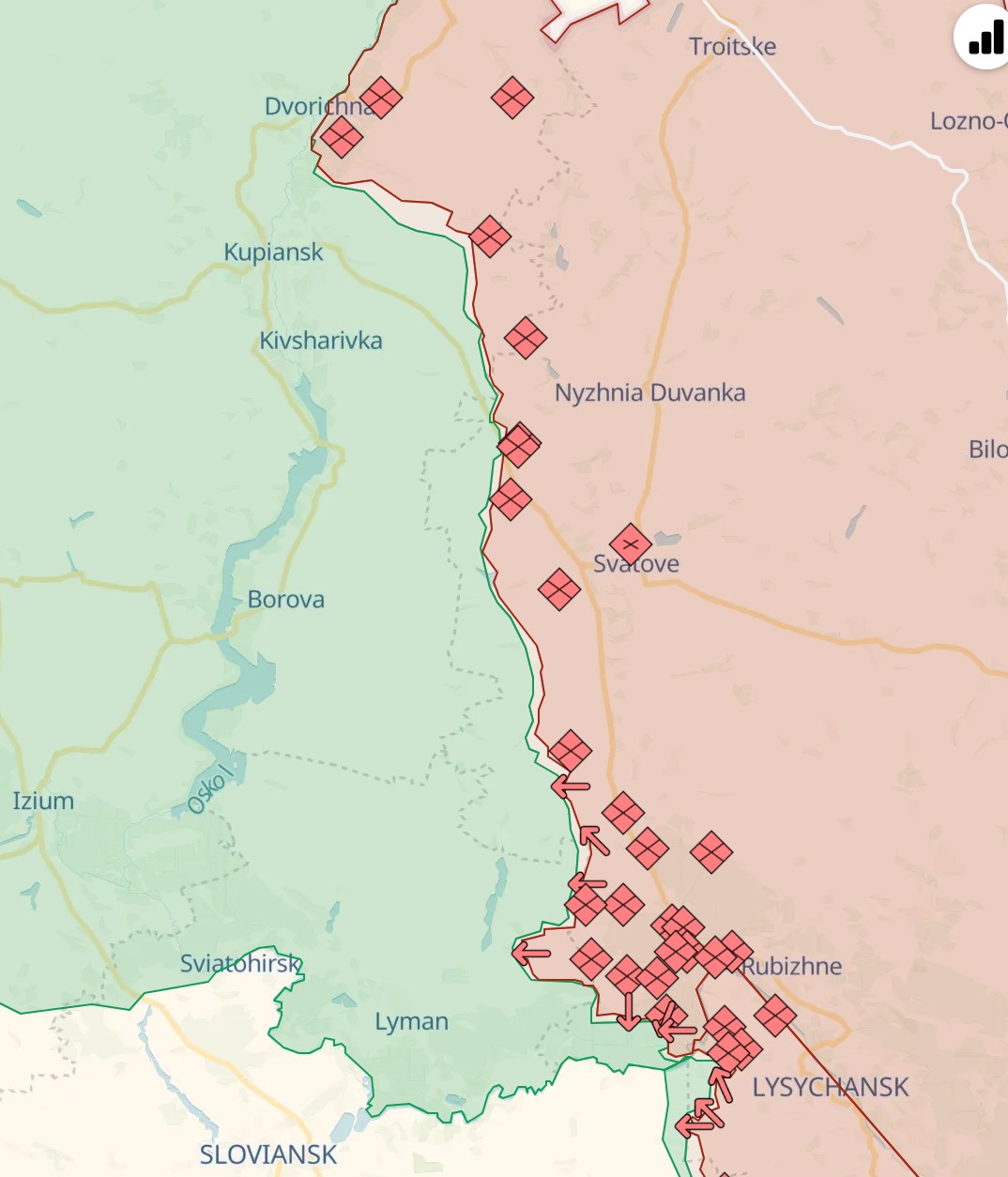 При цьому в районі Сватового та Кремінної наступають навпаки російські війська.