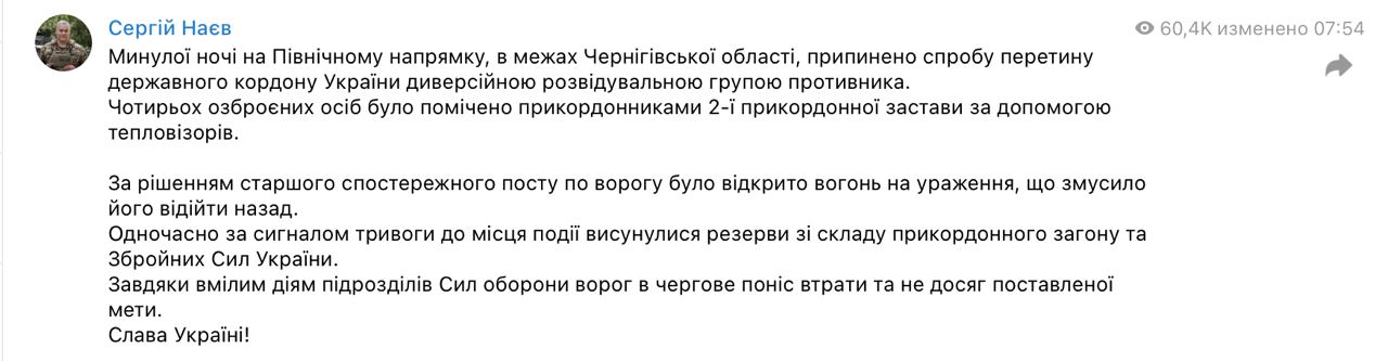 09.12 На Чернігівщині цієї ночі російська ДРГ намагалася перетнути кордон і проникнути в Україну, повідомив командувач Об'єднаних Сил ЗСУ Сергій Наєв.
