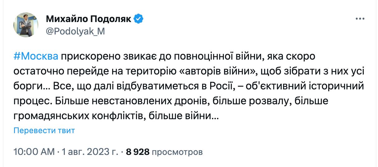 "Москва прискорено звикає до повноцінної війни, яка незабаром остаточно перейде на територію "авторів війни", щоб зібрати з них усі борги... Все, що далі відбуватиметься в Росії, - об'єктивний історичний процес. Більше невстановлених дронів, більше розвалу, більше громадянських конфліктів, Більше війни... ", - написав Подоляк.