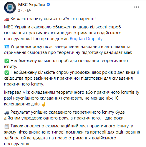 Відповідно до нових правил спочатку потрібно скласти теоретичний іспит, а потім протягом року можна складати і практичний - стільки разів, скільки потрібно.