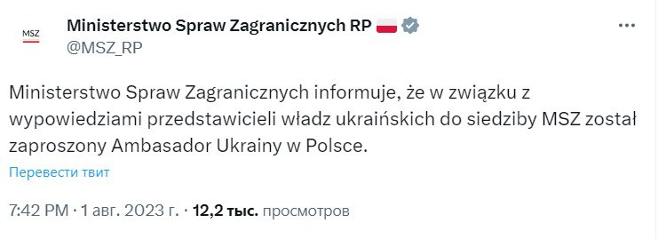 "МЗС інформує, що посла України в Польщі запрошено до резиденції МЗС у зв'язку із заявами представників української влади", - сказано в записі.