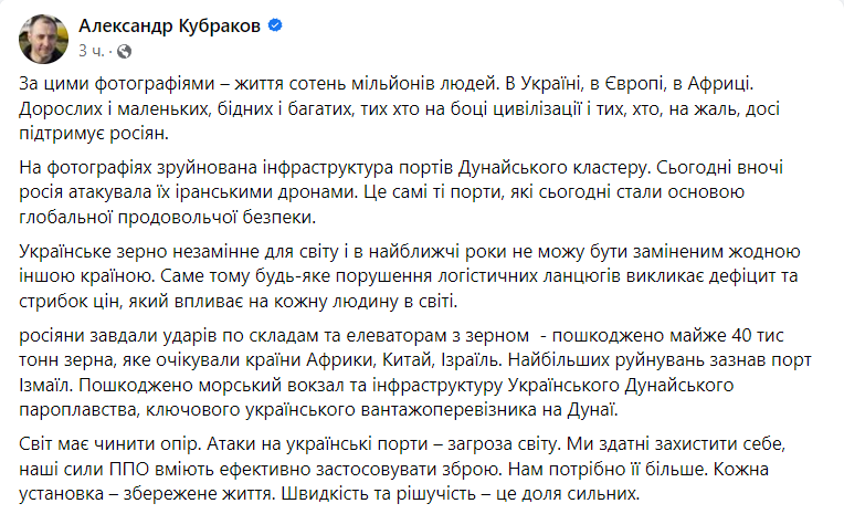 "Росіяни завдали ударів по складах та елеваторах із зерном - пошкоджено майже 40 тисяч тонн зерна, на яке чекали країни Африки, Китай, Ізраїль. Найбільших руйнувань зазнав порт Ізмаїл. Пошкоджено морський вокзал та інфраструктуру Українського Дунайського пароплавства, ключового українського вантажоперевізника на Дунаї", написав Кубрак.