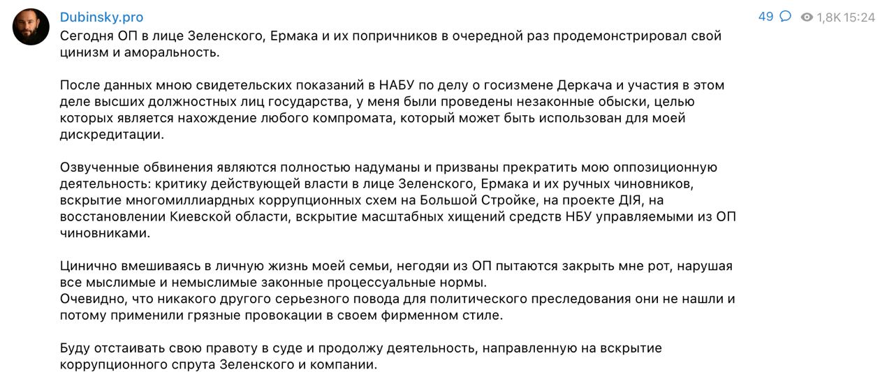 Дубинський пов'язує кримінальну справу зі своїми свідченнями в НАБУ проти Володимира Зеленського та Андеря Єрмака у справі про держзраду Андрія Деркача.