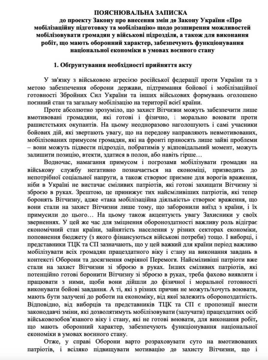 В пояснювальній записці він каже, що захист України можуть забезпечити лише мотивовані громадяни, які готові воювати фізично та морально. Більше того, невмотивовані мобілізовані часто деморалізують своїх товаришів по службі, можуть порушити наказ, залишити позиції або здатися в полон, підставивши побратимів.