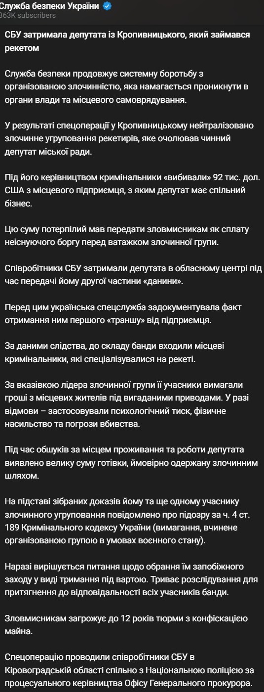 "В результаті спецоперації в Кропивницькому нейтралізовано злочинне угруповання рекетирів, яке очолював чинний депутат міської ради. Під його керівництвом кримінальники "вибивали" 92 тис. дол. США з місцевого підприємця, з яким депутат має спільний бізнес", - йдеться у повідомленні.