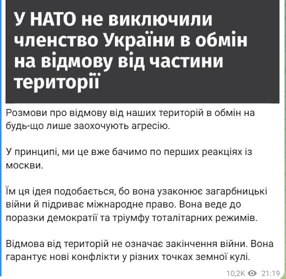 19:49 З'явилася реакція Києва та Москви на пропозицію обміняти членство України в НАТО на територіальні поступки на користь Росії.