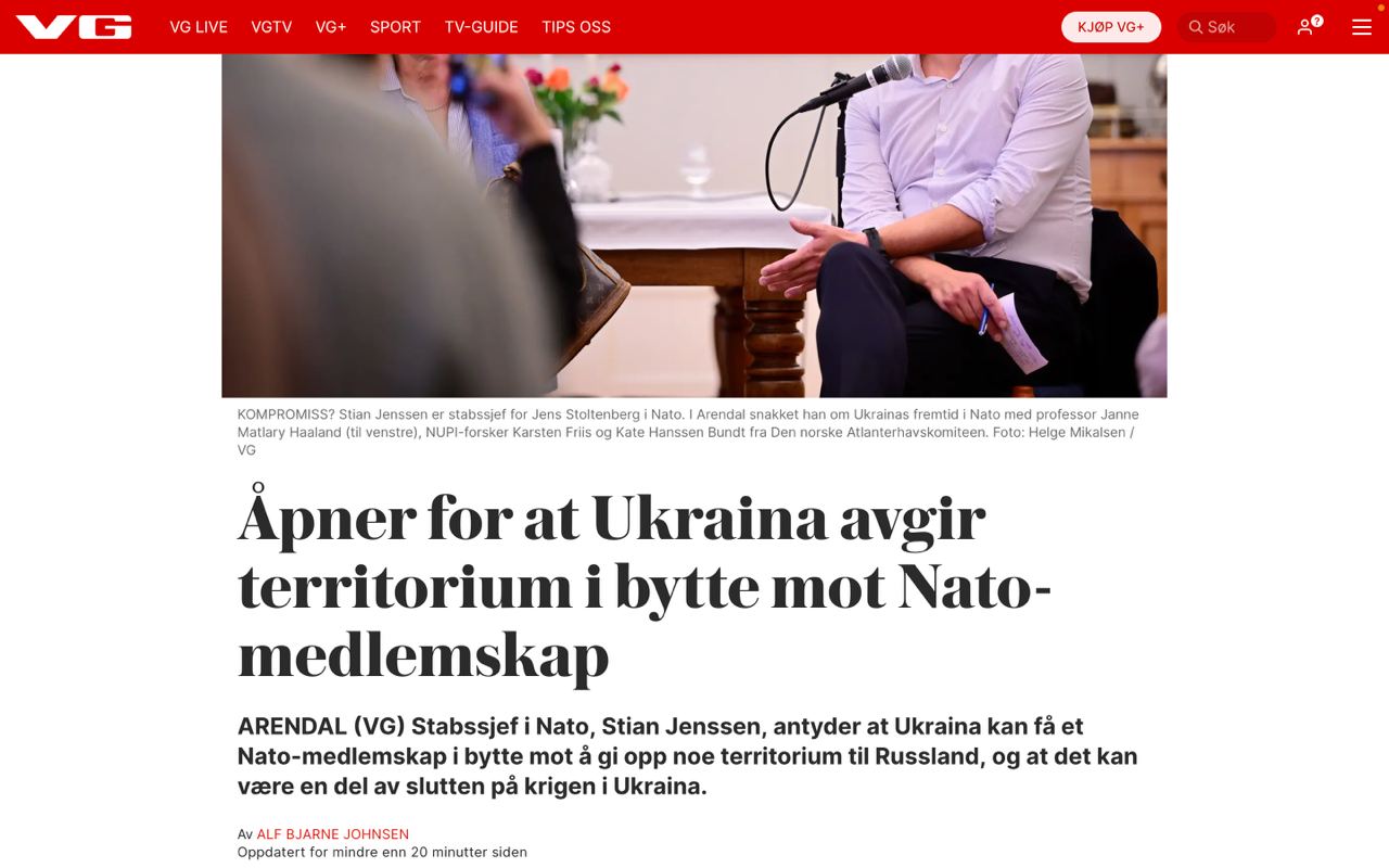 Глава канцелярії генсека НАТО Стіан Єнсен заявив, що Україна може набути членства в НАТО в обмін на поступку частини території РФ, і це може бути частиною угоди щодо припинення війни.