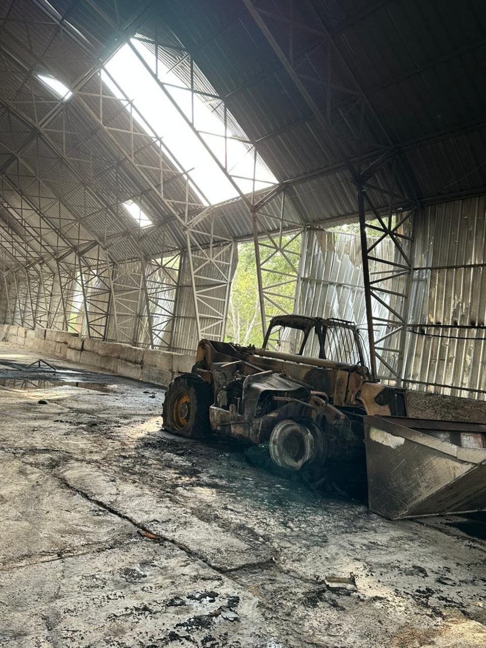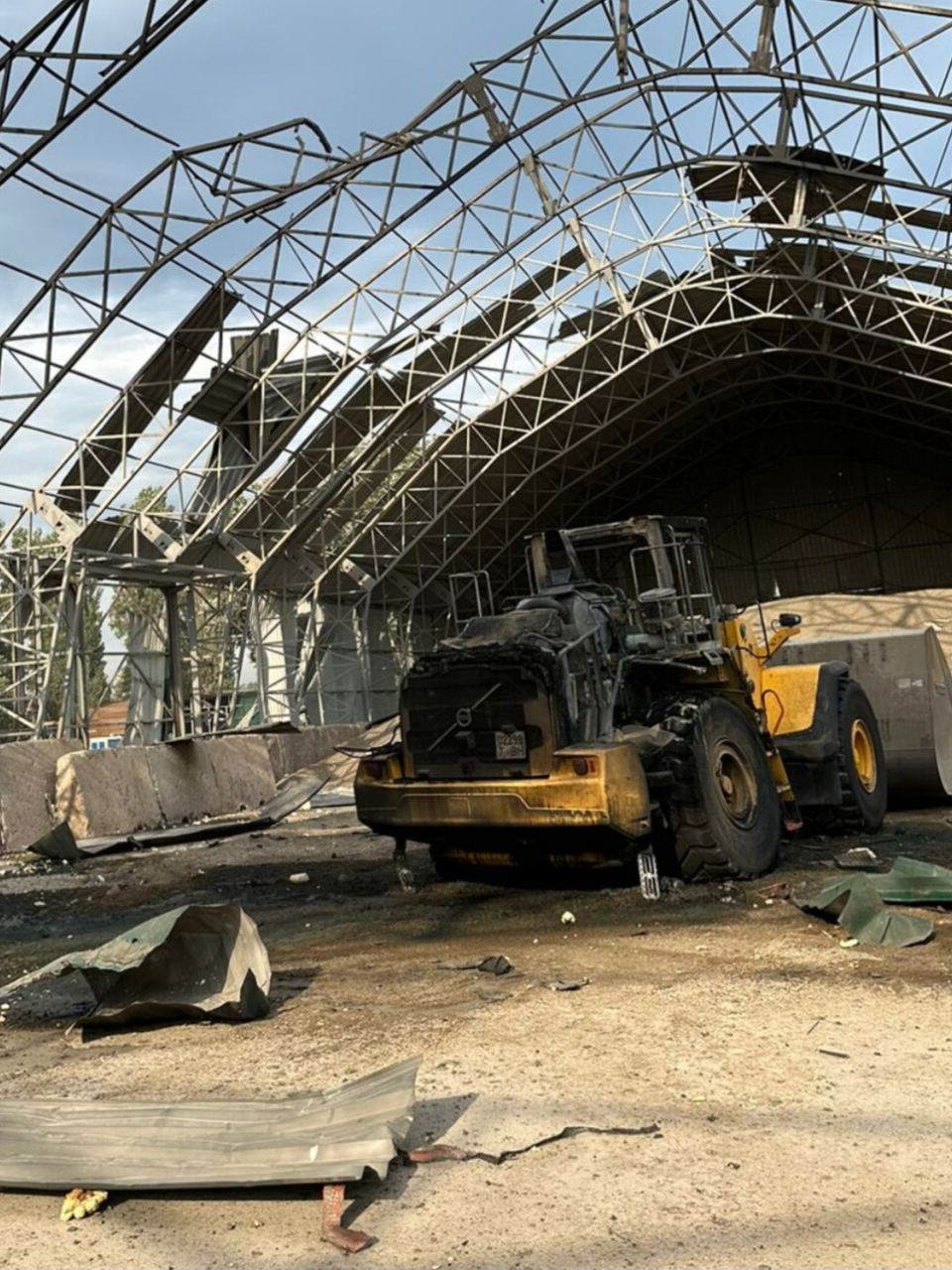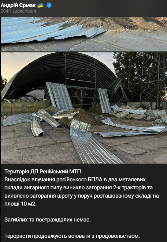 "Територія ДП "Ренійський МТП". Внаслідок влучення російського БПЛА до двох металевих складів ангарного типу виникло загоряння двох тракторів, виявлено загоряння шроту в розташованому поруч складі на площі 10 кв. м", - написав Єрмак.