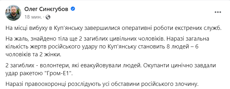 "На жаль, знайдено тіла ще 2 загиблих цивільних чоловіків. Загальна кількість жертв російського удару по Куп'янську становить 8 осіб – 6 чоловіків та 2 жінки", - написав Синегубов.