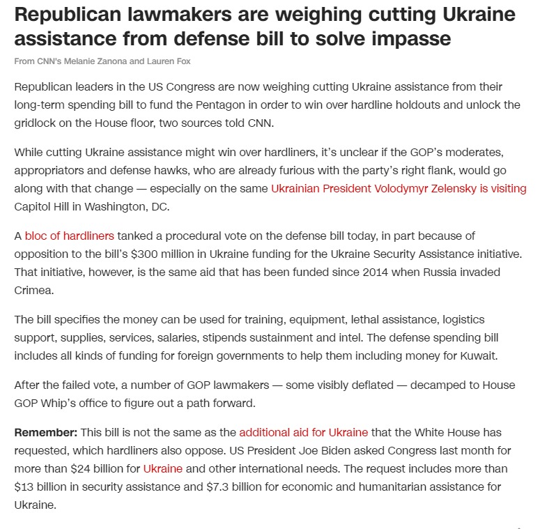 Раніше ми писали, що напередодні візиту Володимира Зеленського до Вашингтона група депутатів-республіканців надіслала президенту США Джо Байдену листа про намір виступити проти прийняття нового пакету допомоги Україні на 24 млрд доларів.
