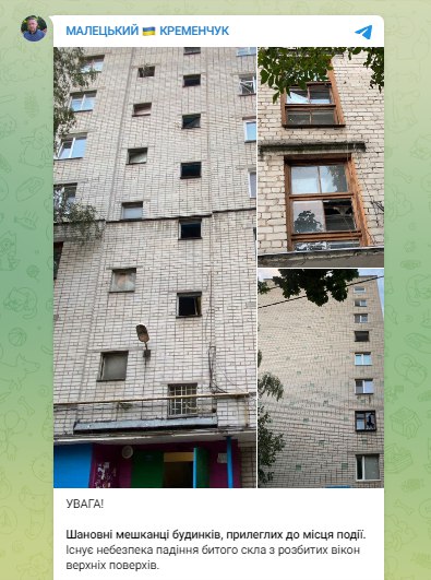 Мер Кременчука Віталій Малецький попереджає людей, щоби не ходили в районі прильоту – тепер через загрозу падіння скла.
