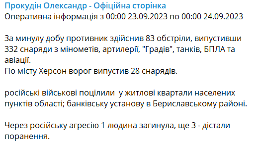 За добу росіяни здійснили 83 обстріли Херсонської області. Одна людина загинула