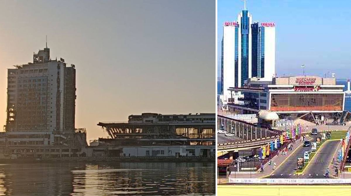 09.32 Фото готелю «Одеса» до та після нічного прильоту та пожежі.